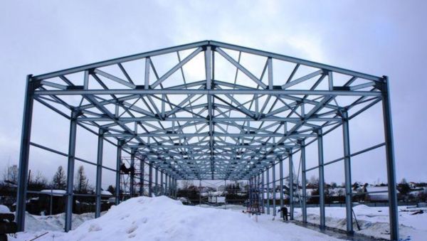 Для изготовления несущего каркаса используют тонкостенные профильные трубы, гнутый уголок и швеллер. В качестве ограждающих конструкций каркас обшивается профилированным листом или не промокающим тентом из ПВХ. При использовании профлиста существует возможность его утепления.